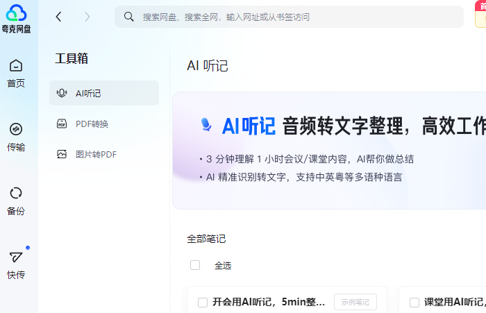文件太多找不到?首页新增内容化卡片,快速查看最近文件和转存文件;PDF转换、AI听记和回收站等网盘常用工具,都可以在首页快速使用