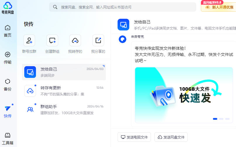 2、快传体验升级:群组里的文件支持一键直接下载,下载后在网盘传输页面可找到