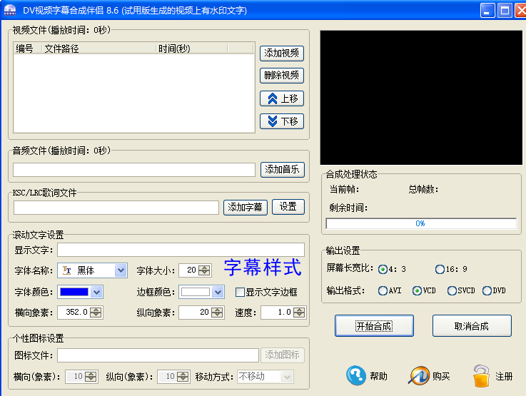 DV视频字幕合成伴侣(视频字幕制作软件)是一款非常实用的能够将WMV、ASF、VCD、MPEG等视频文件中加入卡拉OK字幕或普通字幕的软件。
