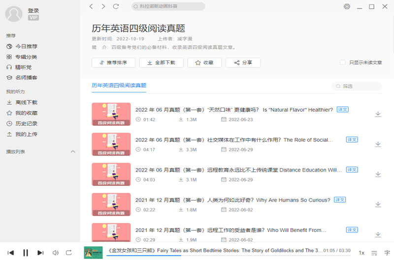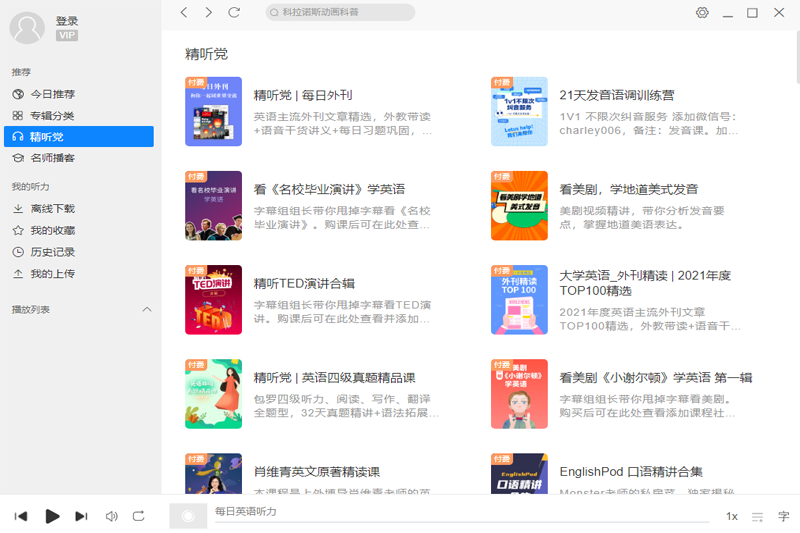 每日英语听力软件VOA标准、VOA慢速、BBC新闻每天更新,收入海量新概念、GRE、TOEFL听力资源,收入海量日常会话训练、名人演讲资源,独家支持语音高亮跟随功能。