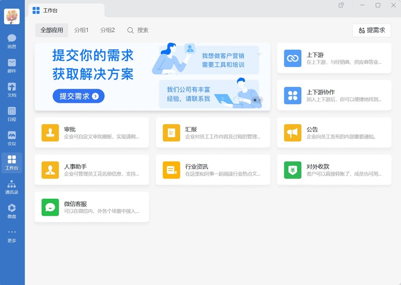 高级功能专区提供了邮件、文档、会议、微盘高级功能,以便成员购买或申请使用,满足更丰富的协作和管理需求。