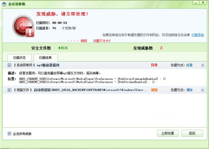 金山急救箱是一款永久免费的木马查杀软件,可快速诊断系统是否中毒,强力查杀顽固和未知木马。并能将系统和上网环境恢复如初。金山急救箱采用全新的云安全技术,不会与任何杀毒软件冲突,是装机的必备安全软件。