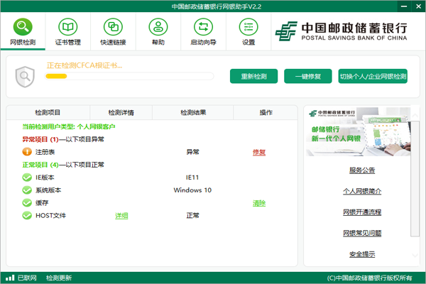 通过邮储网银助手您可以轻松地使用中国邮政储蓄银行的个人网上银行和企业网上银行,它可以帮助您更顺利地登录邮储网上银行,更快捷的打开邮储网上银行的网页,还可以一次性完成所有控件、驱动程序安装。使用邮储网银助手,您可以通过一键修复功能,来安装网银安全控件和UK驱动程序、优化调整您的IE浏览器设置,为您解决密码无法输入、UK无法识别、部分页面无法打开等问题,有效的节省您的时间,方便您的操作。还可以一次性完成所有控件、驱动程序安装。操作界面简洁明了,操作起来也是非常的方便,假如你拥有一张邮政银行卡的话,这款软件是你不二之选哦!