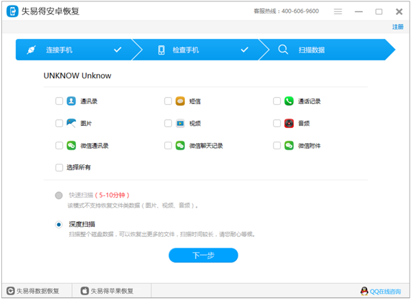 失易得安卓恢复是一款功能强大、界面简洁、操作简单的安卓手机数据恢复工具。支持通讯录、通话记录、短信、照片、视频、音乐等等恢复功能,轻松帮您恢复丢失的联系人、恢复已删除的短信、恢复已删除的照片和图片等等,是真正的手机恢复神器。