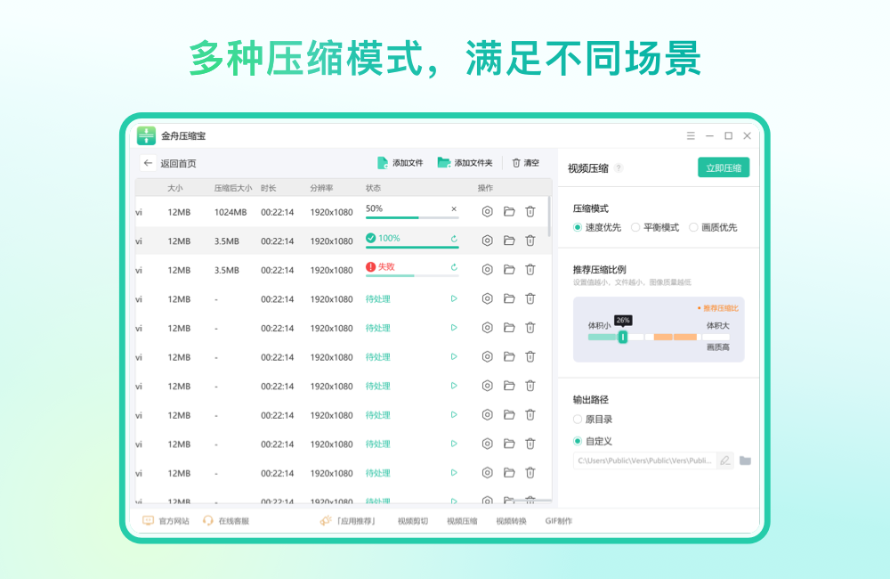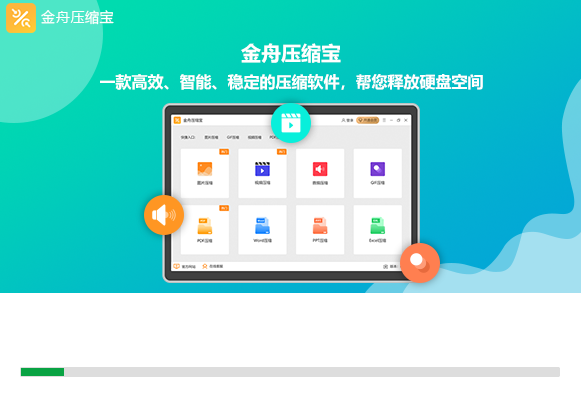 金舟压缩宝一款文件压缩集合软件,集合了视频压缩,GIF压缩,音频压缩,图片压缩,PDF压缩,Word压缩,PPT压缩,Excel压缩;界面简单,功能稳定,支持批量压缩,操作起来非常方便;文件压缩都是在本地完成的,无须上传,能够有效的保证文档安全性;给需要文件压缩的用户带来福音。