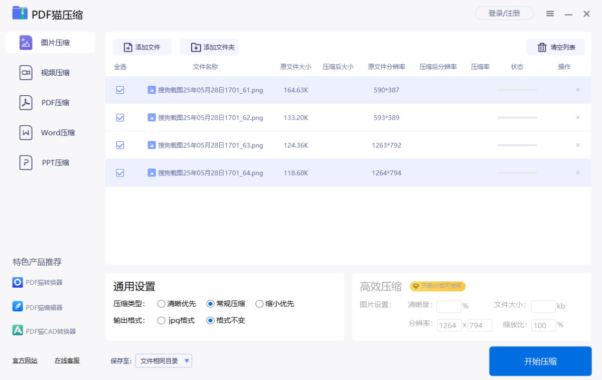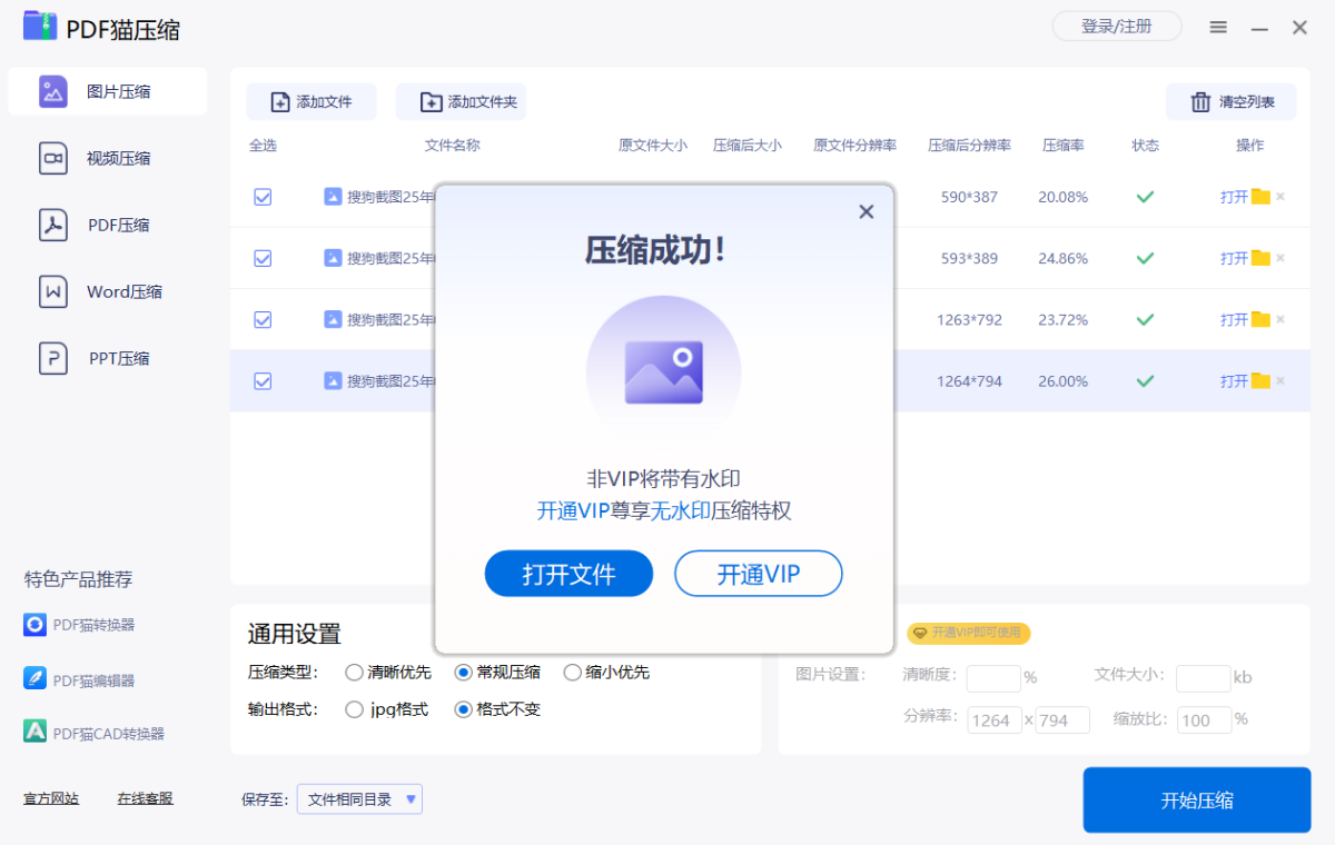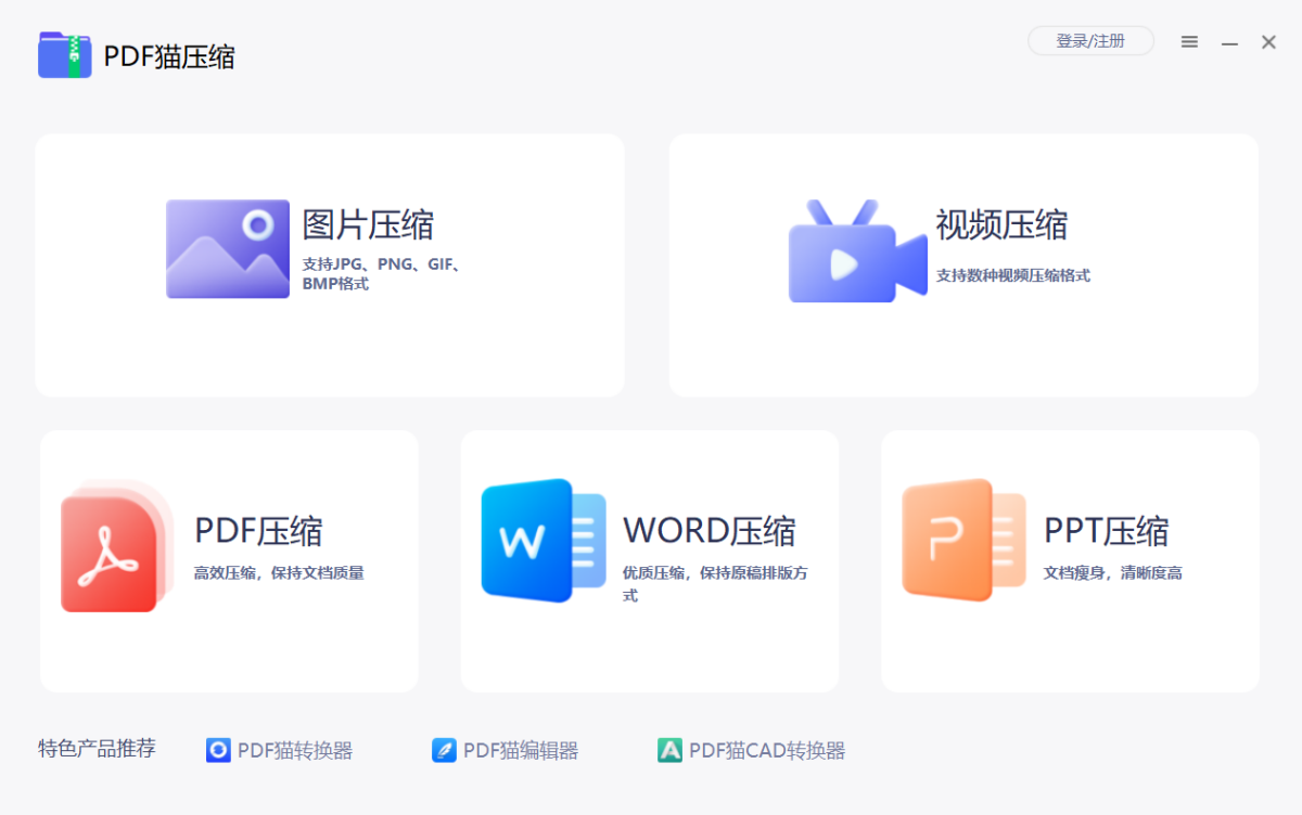 PDF猫压缩器是—款专注于视频压缩、PDF压缩的办公软件,可自定义设置压缩质量,支持批量压缩、无损压缩文件,有效解决文件过大的问题。视频压缩可对视频分辨率进行快速的压缩,且不改变视频文件格式。可设置视频FPS和BPS来控制视大小。PDF压缩可根据需求对PDF文件进行大小压缩。